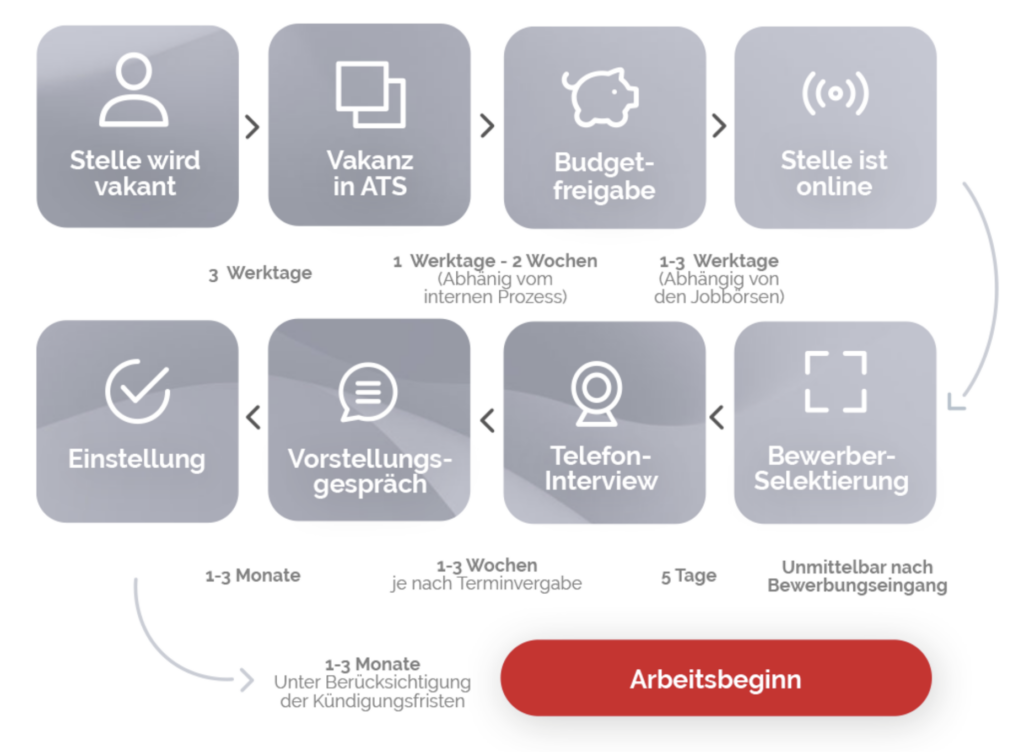 Rechnet man die Mindestwerte zusammen, so ergeben sich im günstigsten Fall 63 Tage bis zur Besetzung einer Stelle. Die Besetzungsdauer kann aber auch bis zu 7 Monate betragen. Lange Vakanzen gehen meist mit gravierende Folgen wie Mitarbeiterfrustration, Qualitätseinbußen oder Produktionsausfälle einher. Die Zahlen sprechen eine deutliche Sprache: Die geplante Vakanzzeit lag im vergangenen Jahr bei rund 62 Tagen, die tatsächliche Vakanzzeit dauerte jedoch länger als drei Monate (93 Tage).