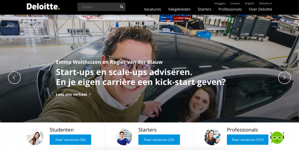 Bas: “Bij Deloitte hebben we 6 bedrijfstakken die allerlei verschillende profielen zoeken, maar ook dezelfde. Denk bijvoorbeeld aan een developer. Veel van hen overwegen Deloitte niet als potentiële werkgever, omdat zij niet bekend zijn met onze bedrijfstakken en mogelijkheden. Als developer kun je bijvoorbeeld aan de slag bij Technology Consulting, maar ook bij wat meer traditionele bedrijfstakken als Tax & Legal. De kans is klein dat je daar als technische schoolverlater aan denkt. Er zijn gelukkig ook doelgroepen die eenvoudig te overtuigen zijn. Zo kennen bijna alle financiële studenten Deloitte en zijn zij bekend met de kansen die er liggen. Wij staan bekend als een geweldige werkgever voor starters, maar aan de andere kant, wij hebben ook mediors en seniors nodig.”